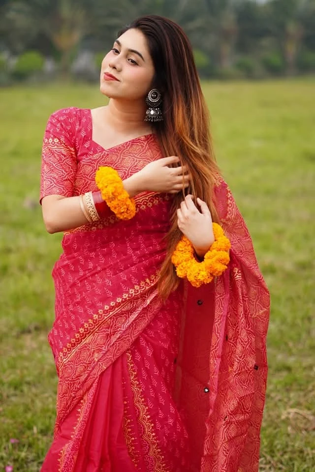 ডিটেইলস: আকর্ষণীয় সেমি মসলিন শাড়ি, আফসান্ট প্রিণ্টের কাজ।